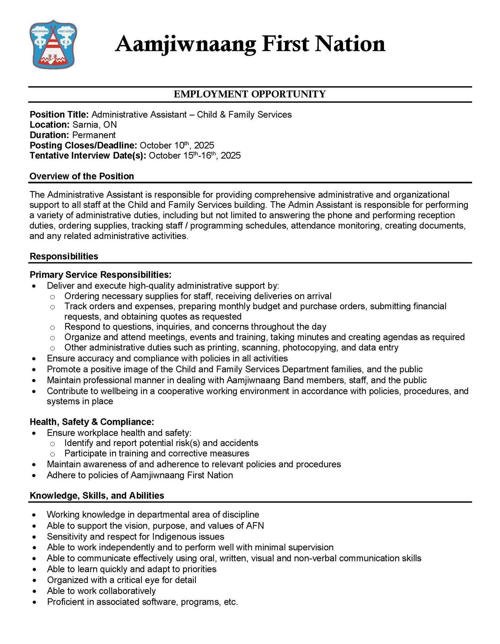 The Administrative Assistant is responsible for providing comprehensive administrative and organizational support to all staff at the Child and Family Services building. The Admin Assistant is responsible for performing a variety of administrative duties, including but not limited to answering the phone and performing reception duties, ordering supplies, tracking staff/programming schedules, attendance monitoring, creating documents, and any related administrative activities.
