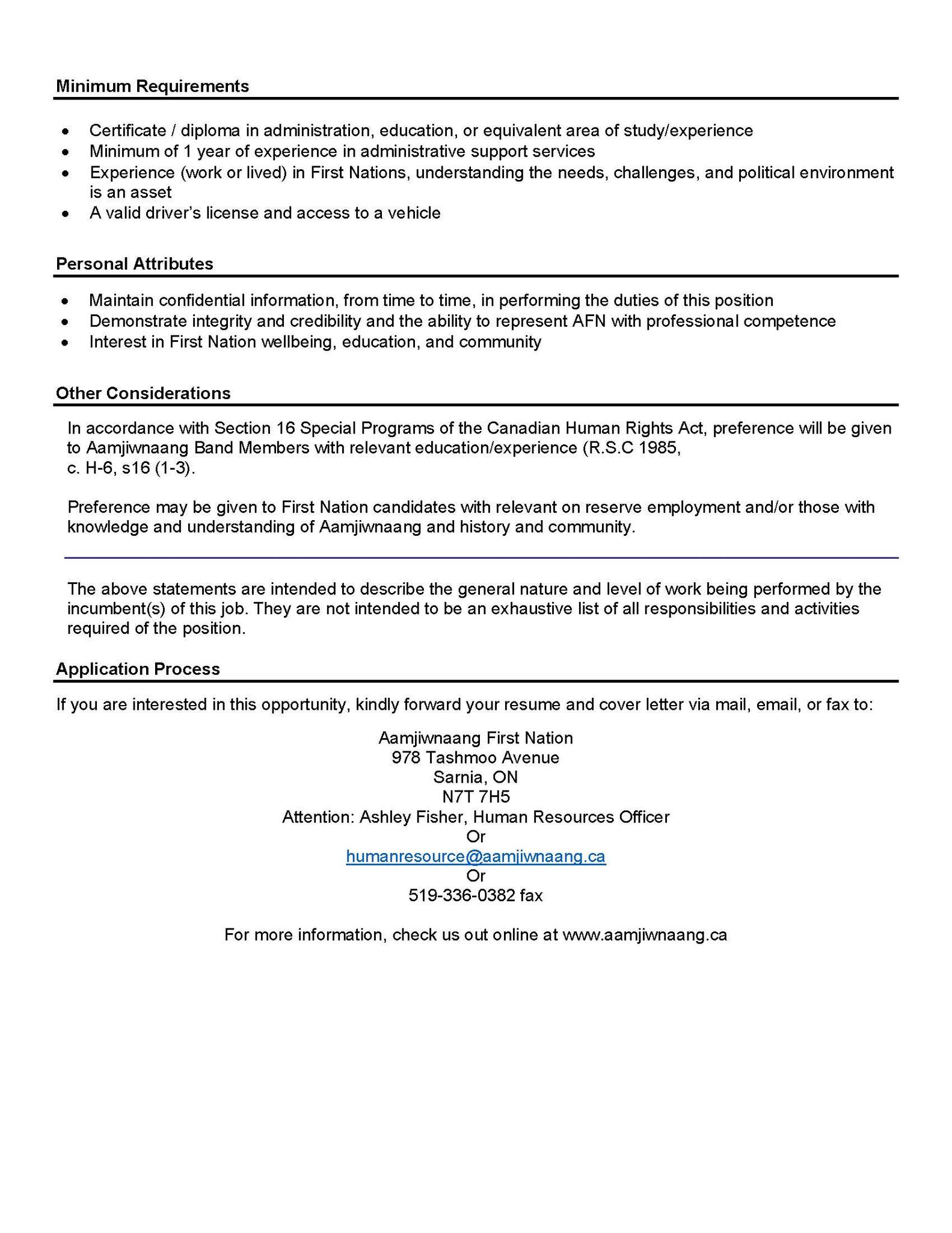 In accordance with Section 16 Special Programs of the Canadian Human Rights Act, preference will be given to Aamjiwnaang Band Members with relevant education/experience (R.S.C 1985, c. H-6, s16 (1-3).