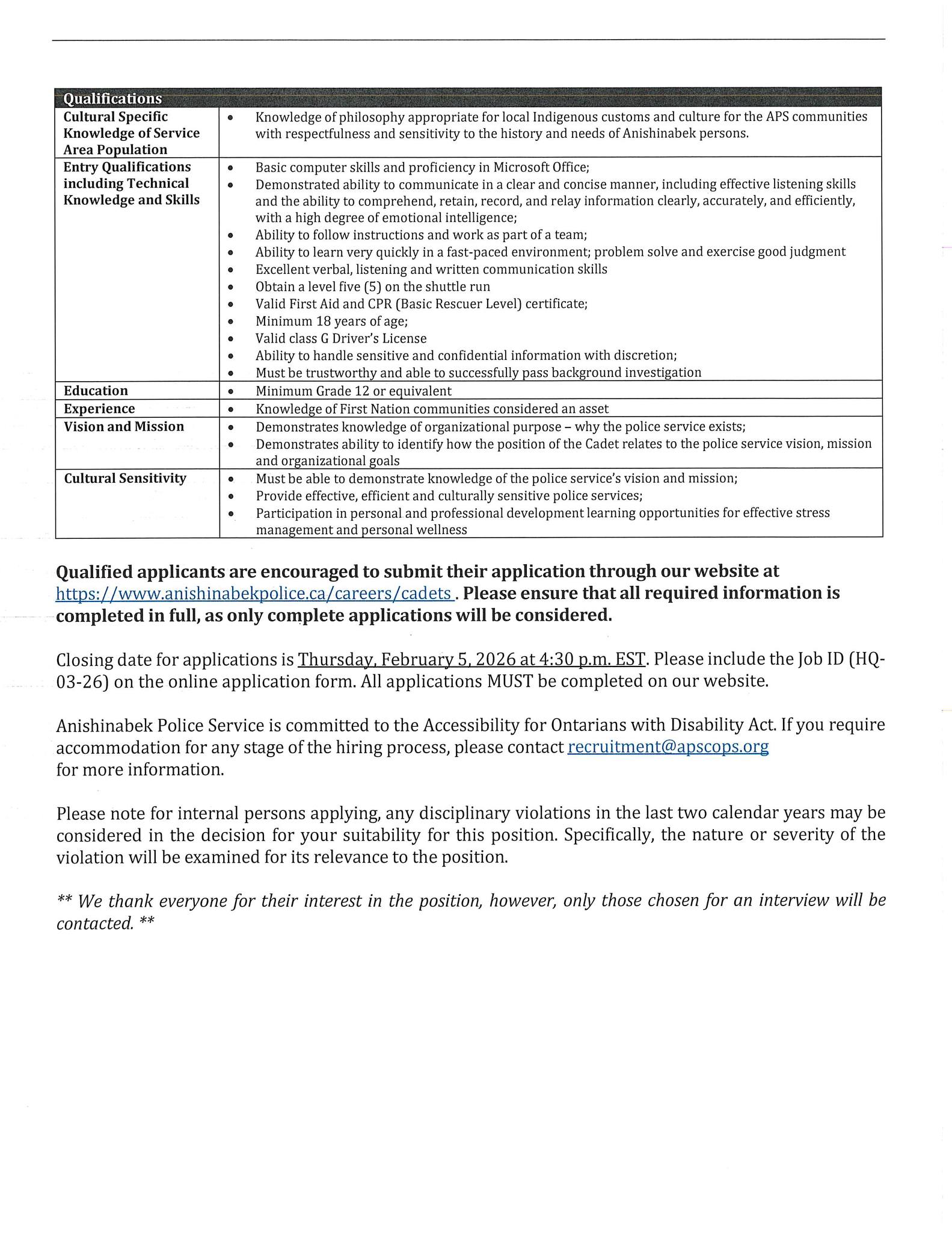 Qualified applicants are encouraged to submit their application through our website at Cadets – Anishinabek Police Service. Please ensure that all required information is completed in full, as only complete applications will be considered.