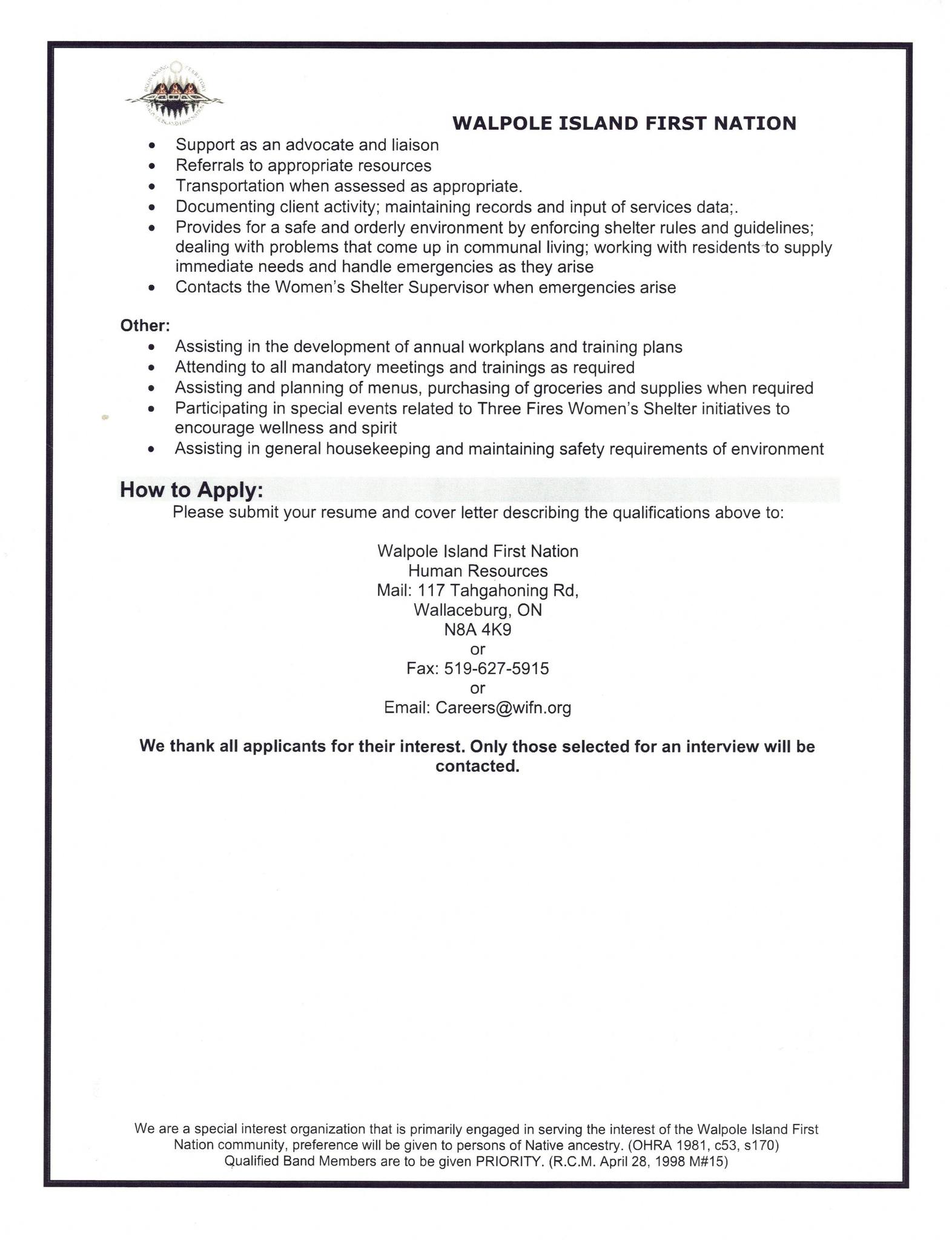 - Contacts the Women’s Shelter Supervisor when emergencies arise