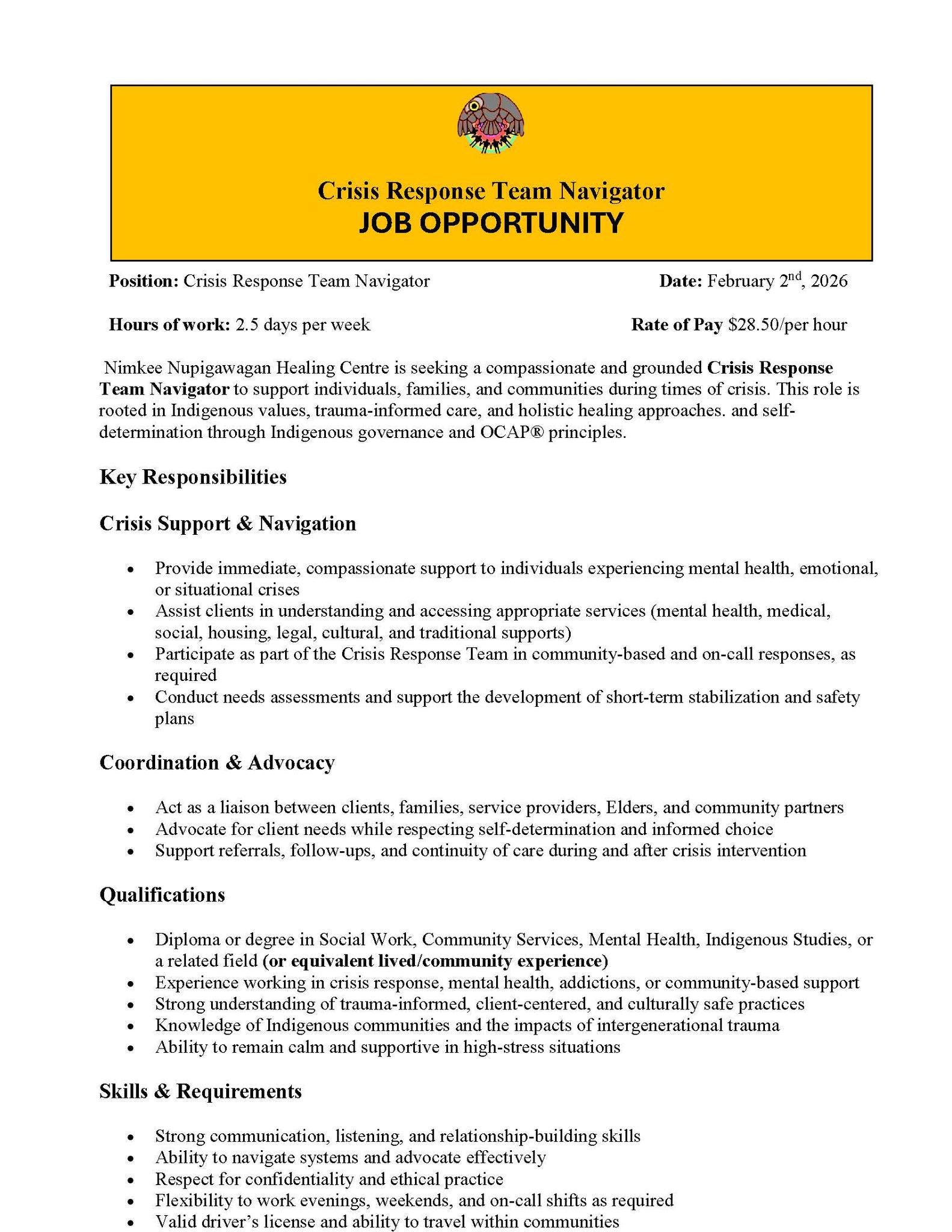 Nimkee Nupigawagan Healing Centre is seeking a compassionate and grounded Crisis Response Team Navigator to support individuals, families, and communities during times of crisis. This role is rooted in Indigenous values, trauma-informed care, and holistic healing approaches and self-determination through Indigenous governance and OCAP principles.