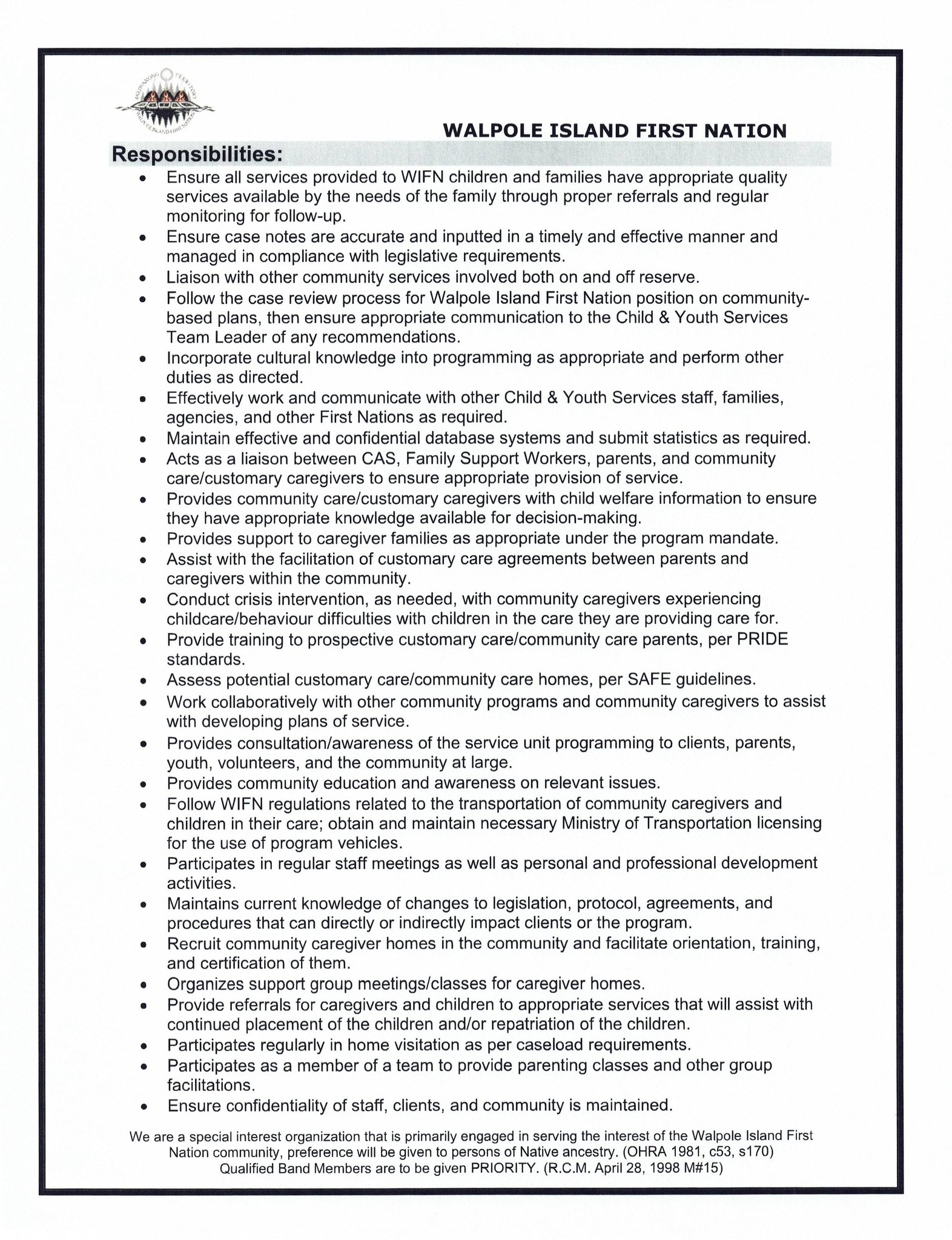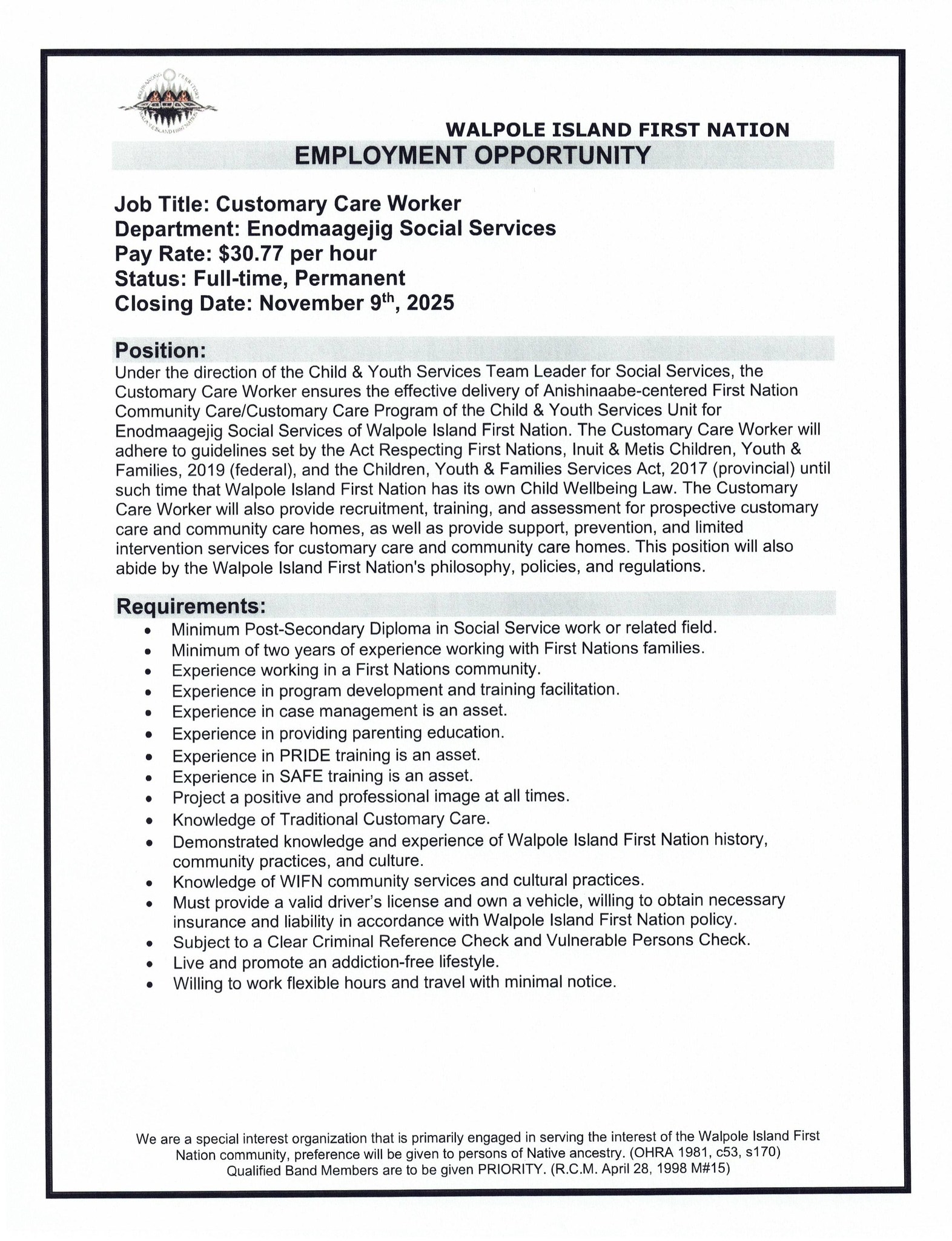 Under the direction of the Child &  Youth Services Team Leader for Social Services, the Customary Care Worker ensures the effective delivery of Anishinaabe-centered First Nation Community Care/Customary Care Program of the Child & Youth Services Unit for Enodmaagejig Social Services of Walpole Island First Nation.  The Customary Care Worker will adhere to guidelines set by the Act Respecting First Nations, Inuit & Metis Children, Youth & Families, 2019 (federal), and the Children, Youth & Families Services Act, 2017 (provincial) until such time that Walpole Island First Nation has its own Child Wellbeing Law. The Customary Care Worker will also provide recruitment, training, and assessment for prospective customary care and community care homes, as well as provide support, prevention, and limited intervention services for customary care and community care homes. This position will also abide by the Walpole Island First Nation’s philosophy, policies, and regulations.