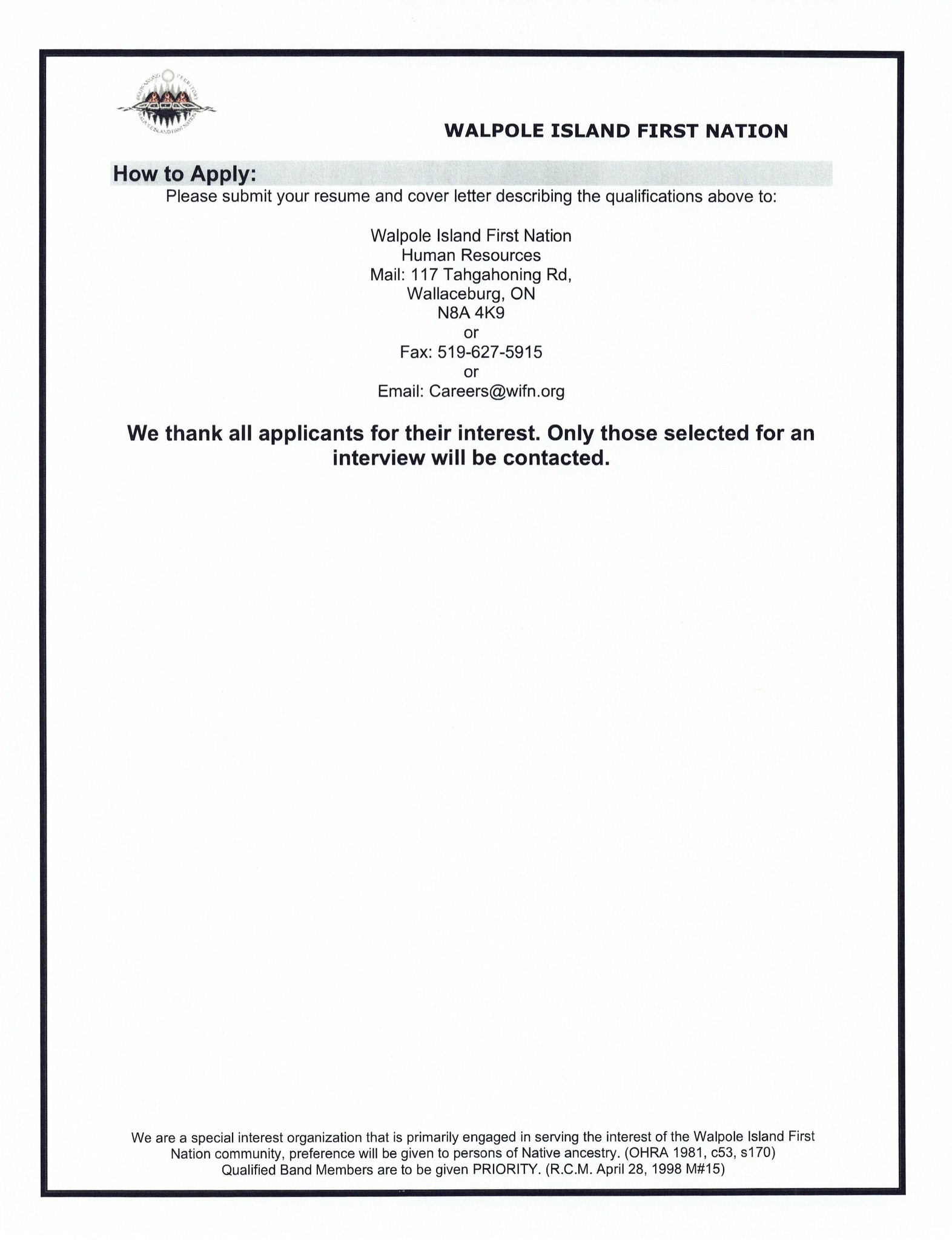 • Must provide a valid driver’s license and own a vehicle, willing to obtain necessary insurance and liability in accordance with Walpole Island First Nation policy.