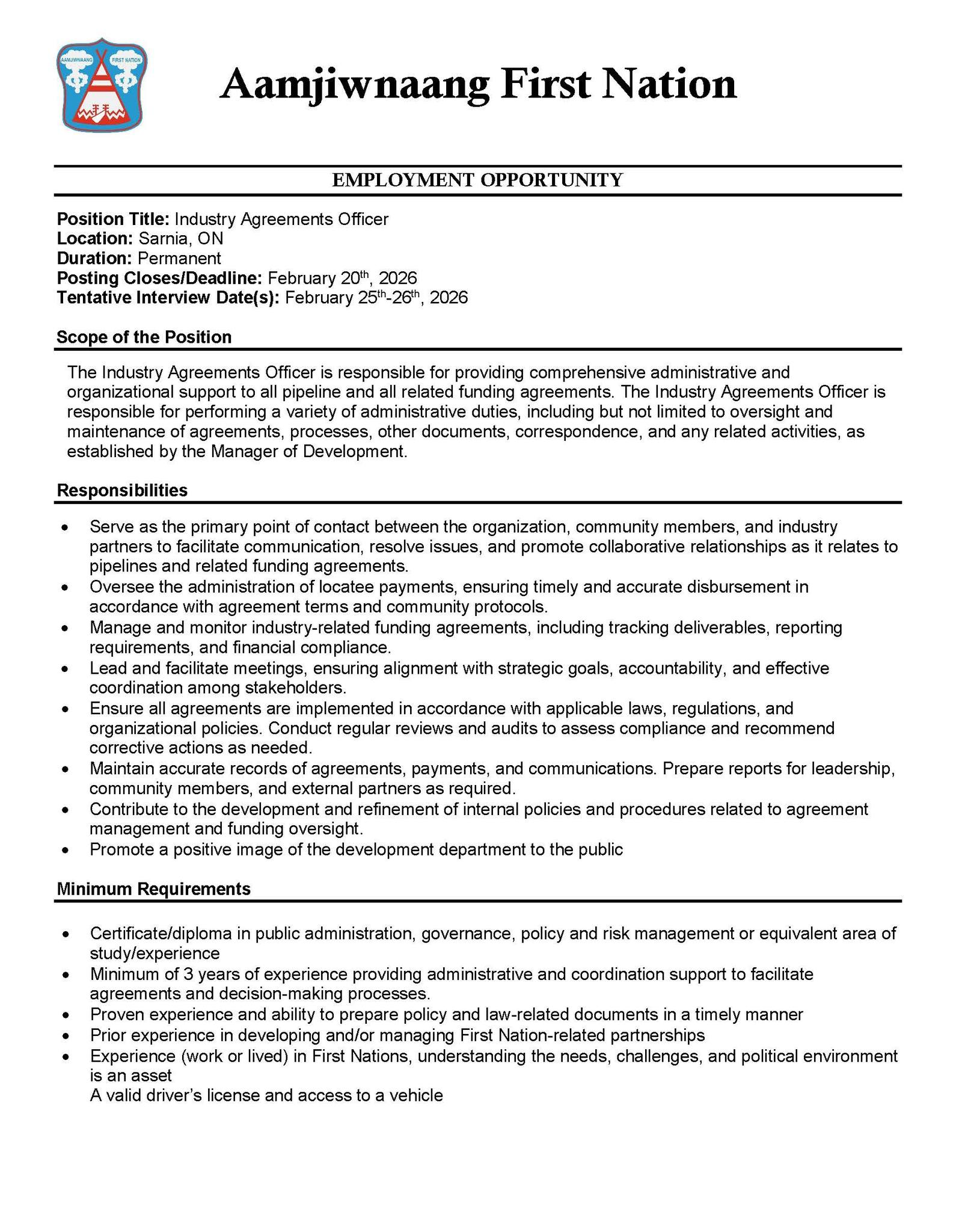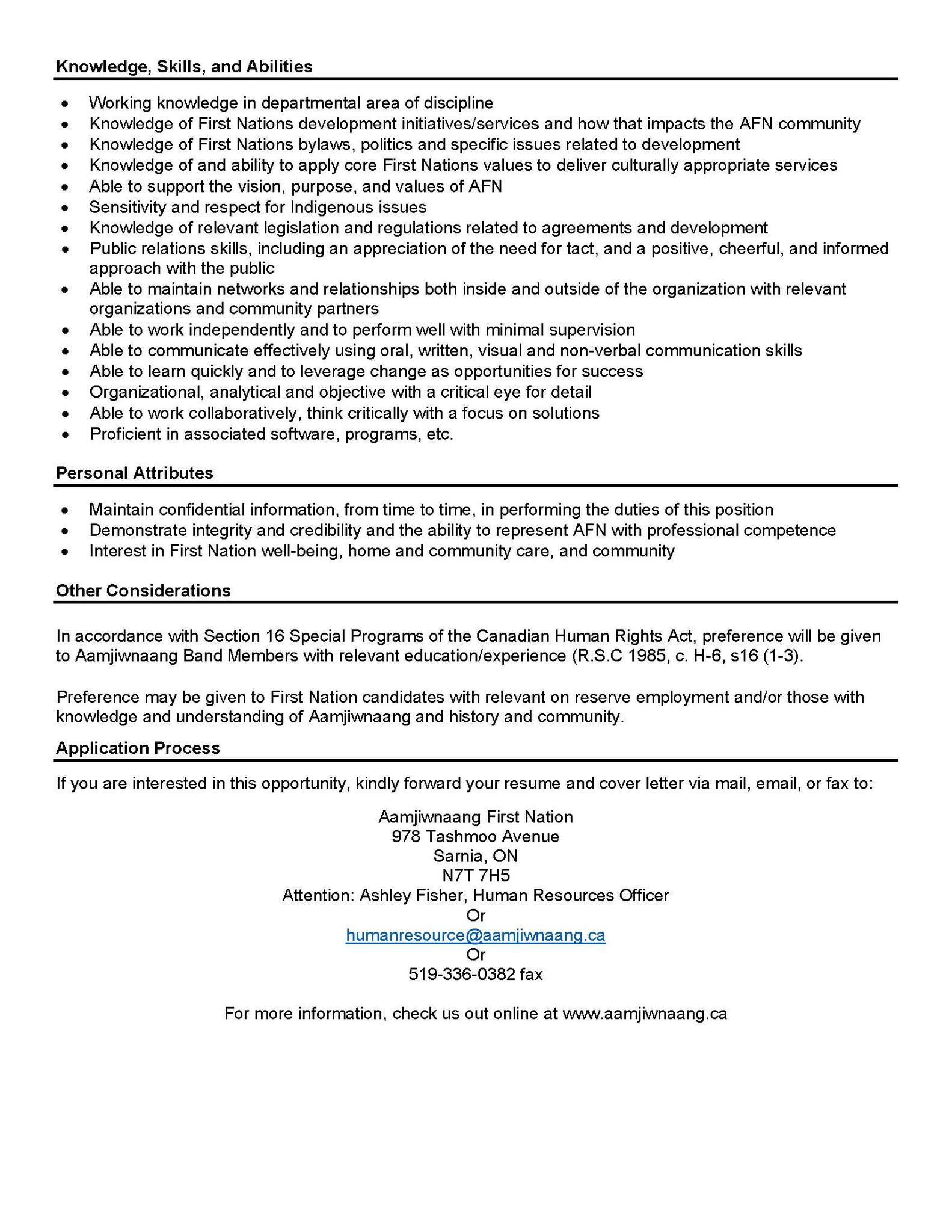 In accordance with Section 16 Special Programs of the Canadian Human Rights Act, preference will be given to Aamjiwnaang Band Members with relevant education/experience (R.S.C 1985, c. H-6, s16 (1-3).