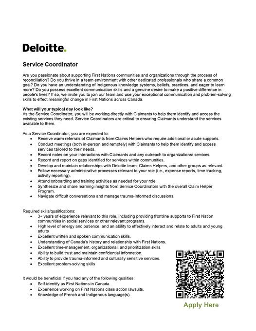 • Required Experience3+ years of experience relevant to this role, including providing frontline supports to First Nation communities in social services or other relevant programs.