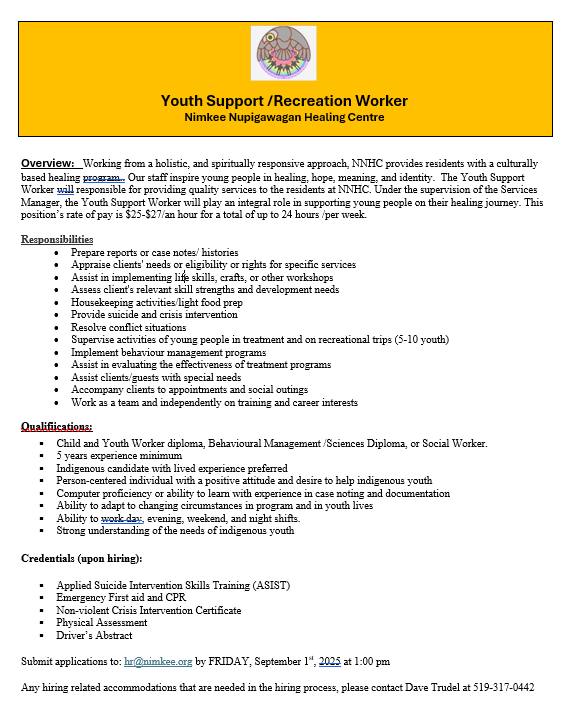 Working from a holistic, and spiritually responsive approach, NNHC provides residents with a culturally based healing program. Our staff inspire young people in healing, hope, meaning, and identity. The Youth Support Worker will be responsible for providing quality service to the residents at NNHC. Under the supervision of the Services Manager, the Youth Support Worker will play an integral role in supporting young people on their healing journey. This position’s rate of pay is $25-$27/an hour for a total of up to 24 hours/per week.